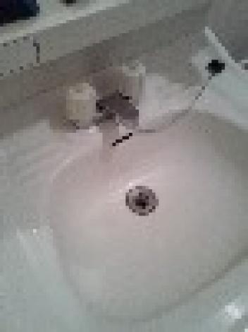 洗面化粧台は、陶器製で白色の洗面ボールが設置され、水栓をひねるタイプの旧式な水栓が付いており、ハンドルを取り扱ってみますと、若干緩くなっているように感じました。