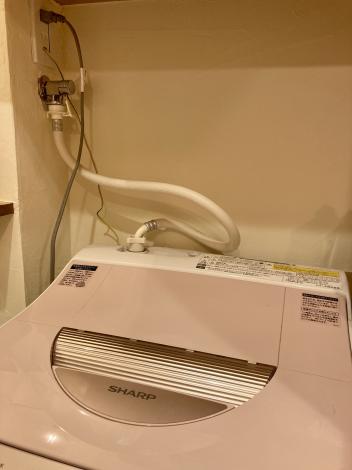 案内された洗面所には、比較的大きな洗濯機があり、広めのスペースが確保されているように見えました。