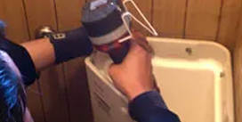 復旧作業例(トイレの詰まり):紙・汚物などの詰まりの場合には圧力ポンプで復旧します。異物の詰まりが原因の場合はトイレを脱着して除去します。